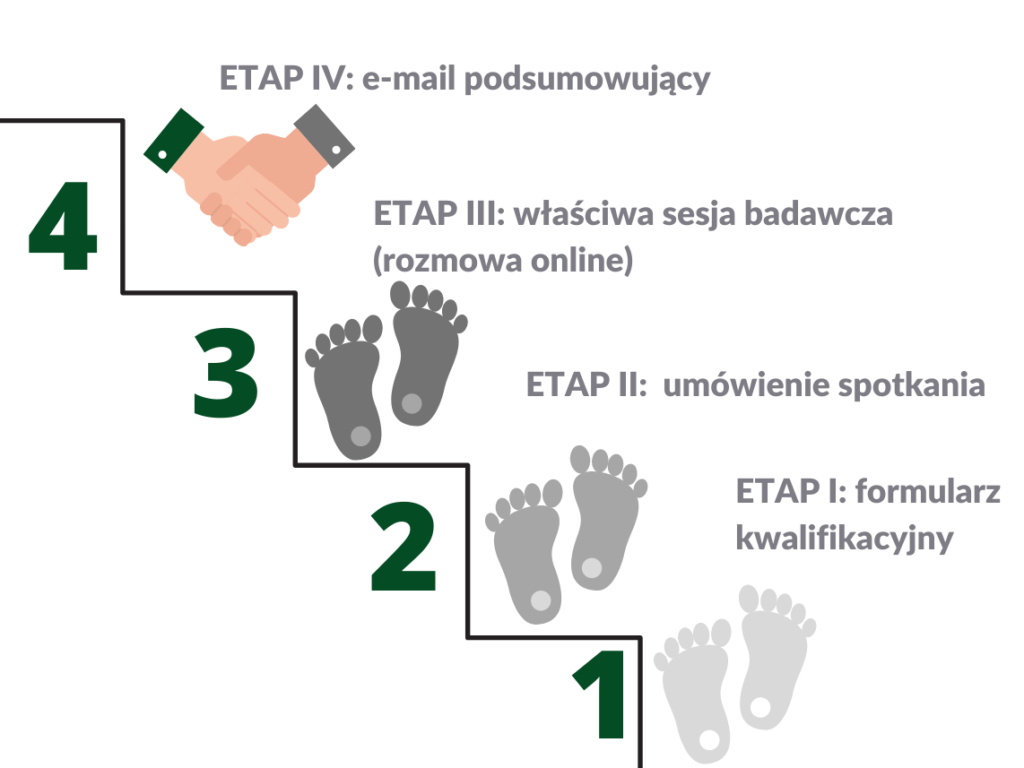 Jak poinformuję Cię o wynikach postępowania kwalifikacyjnego? – poproszę Cię też o zostawienie do siebie kontaktu (adres e-mail) – dzięki temu będą mogła przekazać Ci informacje zwrotne o spójności Twojego profilu z celem prowadzonego przeze mnie projektu naukowego. W wypadku pozytywnej kwalifikacji, umówię się z Tobą na bardziej szczegółową rozmowę, czyli właściwy etap badania (etap II). Podanie adresu e-mail jest ważne, abym mogła się z Tobą skontaktować. Nie będę go udostępniać żadnym osobom trzecim.